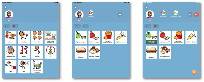 Then, a simple message can be creating by first selecting a category (folder) like "I am hungry." Then a more specific phrase is added from from the cards: "May I have an apple?"