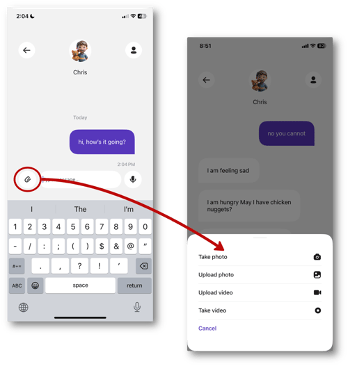 From the messaging screen, just select the attachment button to take or choose a photo or video to send.